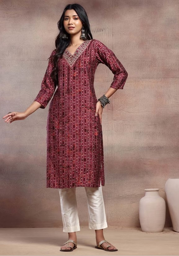 Maroon Geometric Print V-Neck Cotton Straight Kurta