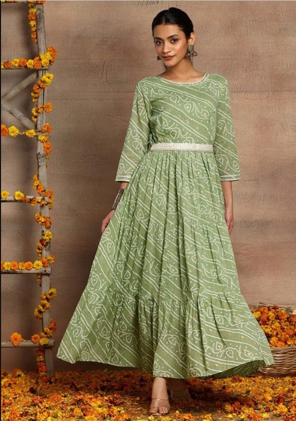 Green Bandhani Print Cotton Tiered Dress With Belt (Set of 2)