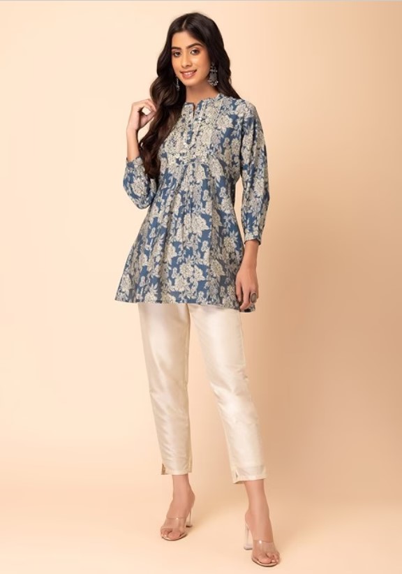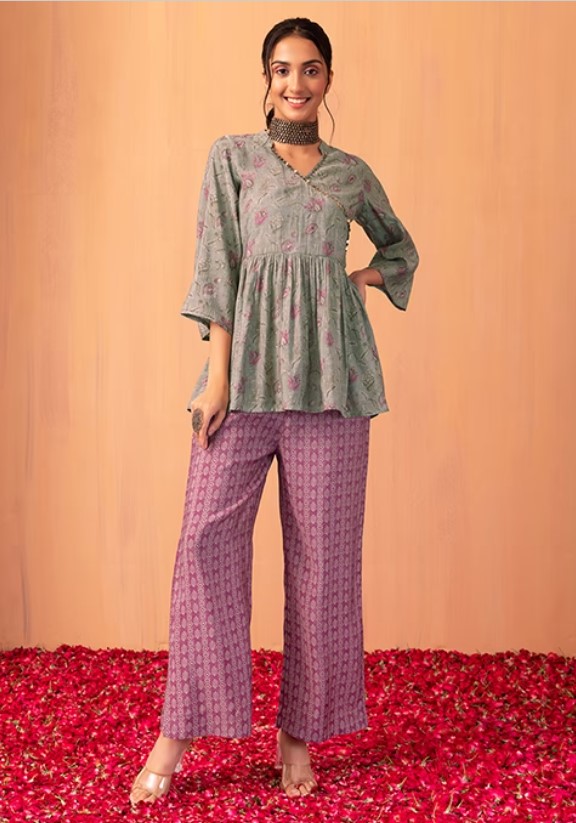 Grey Floral Print Muslin Angrakha Kurta And Contrast Pants (Set of 2)