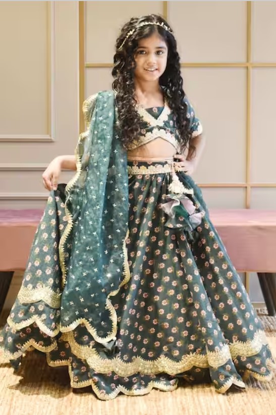 Green Lehenga And Blouse Cotton Printed Floral Set For Girls