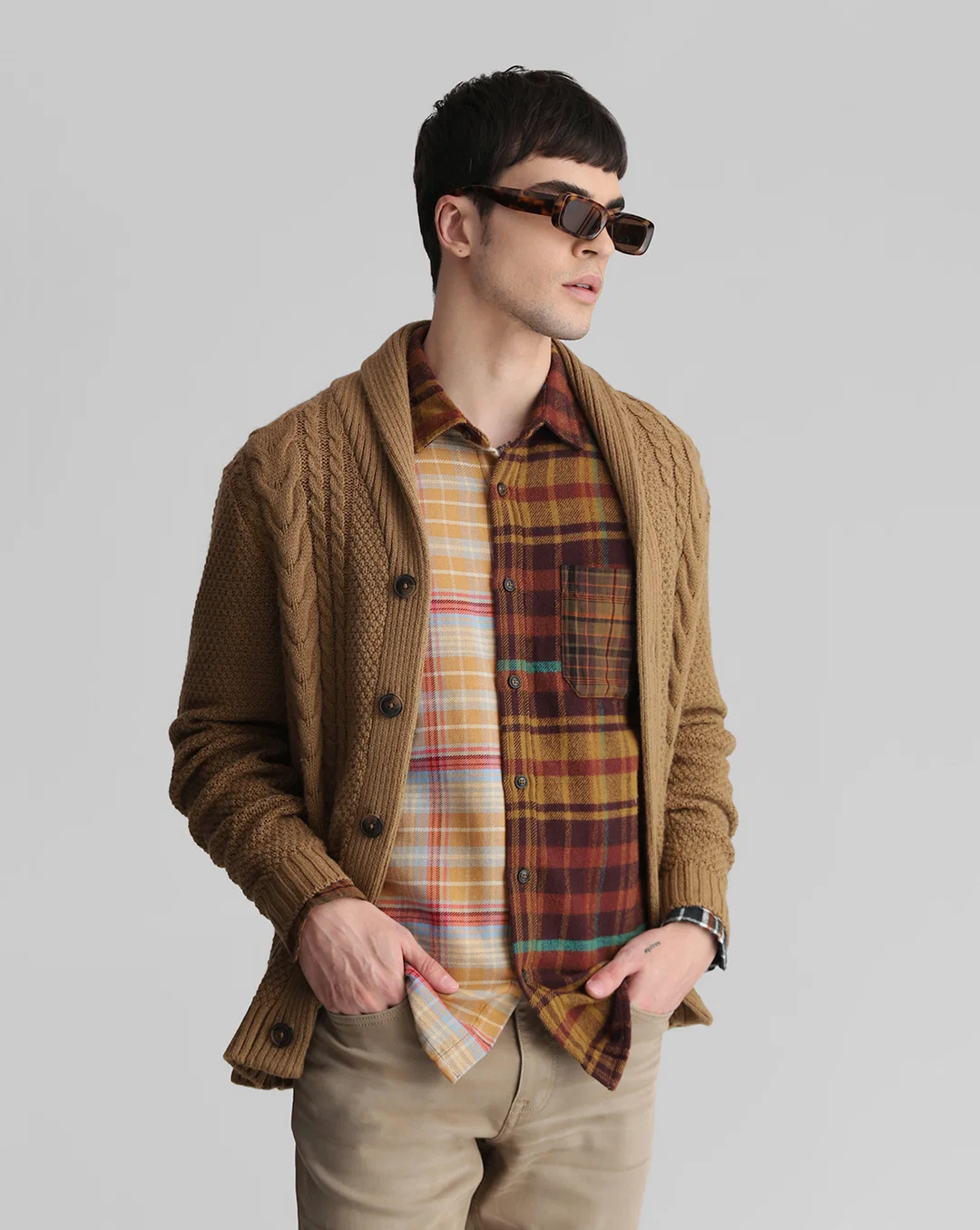 Brown Knit Shawl Neck Cardigan