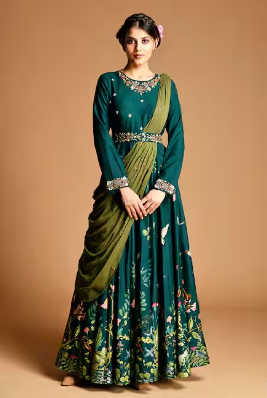 Green Dola Silk Round Anarkali With Draped Dupatta For Women